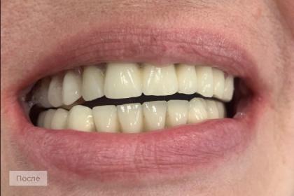 Проведено комплексное исследование как зубов, так и состояния суставов. Было принято решение не менять положение челюстей относительно друг друга, а за счет коронок изменить положение зубов в челюсти. В боковом отделе был установлен бюгельный протез на замковом креплении.